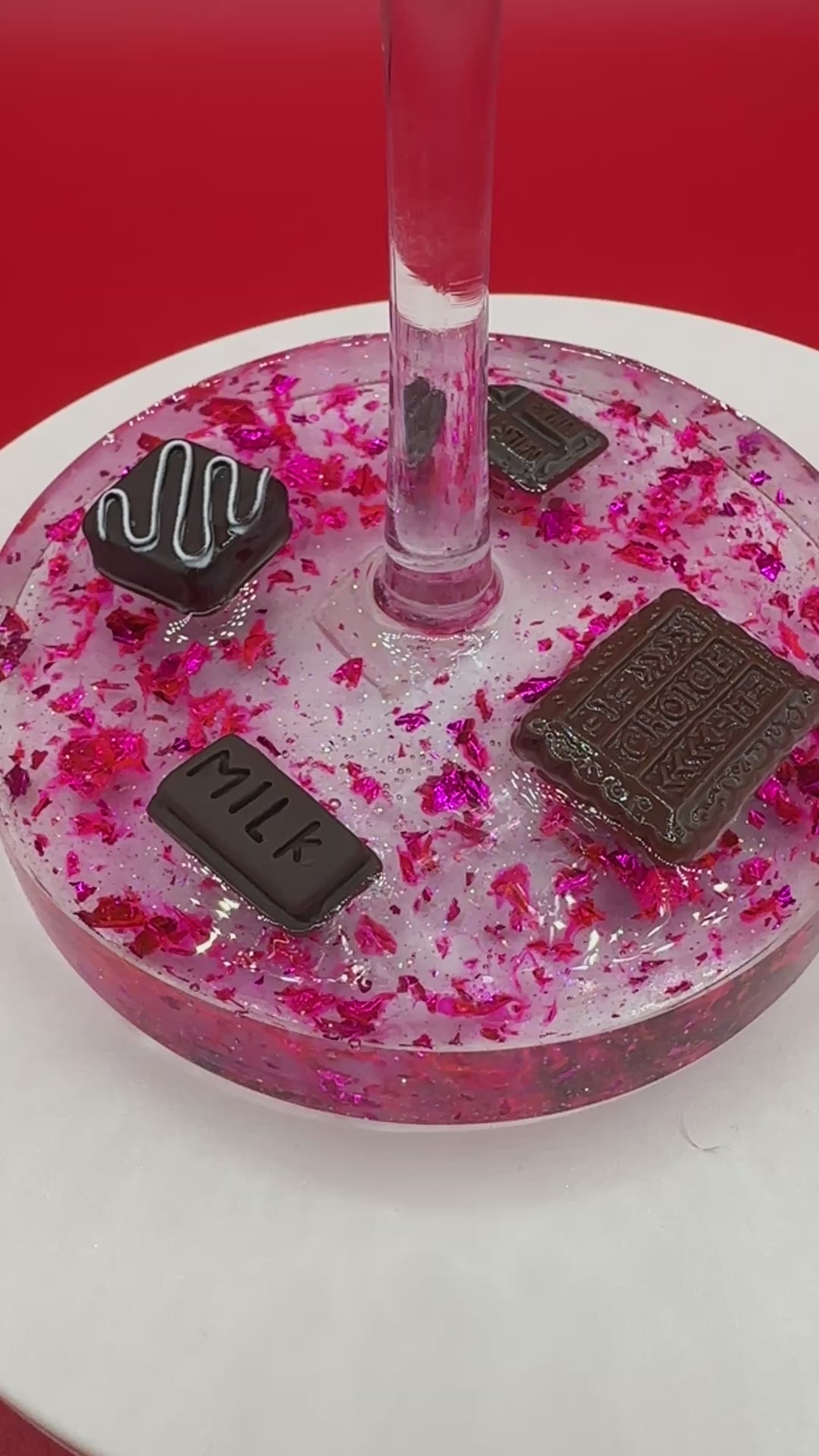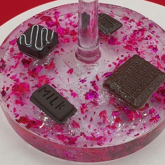 Shatterproof 16 oz acrylic wine glass with Valentine's hearts and chocolates in a pink glitter decorative resin base. Hand wash only. This is not dishwasher safe.