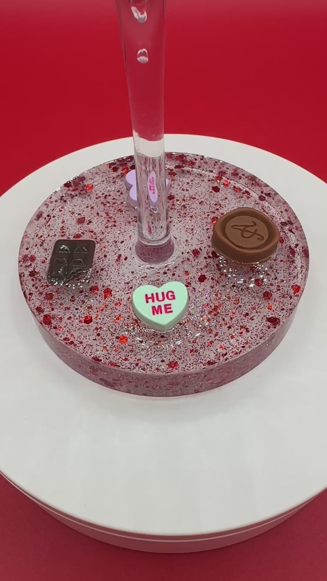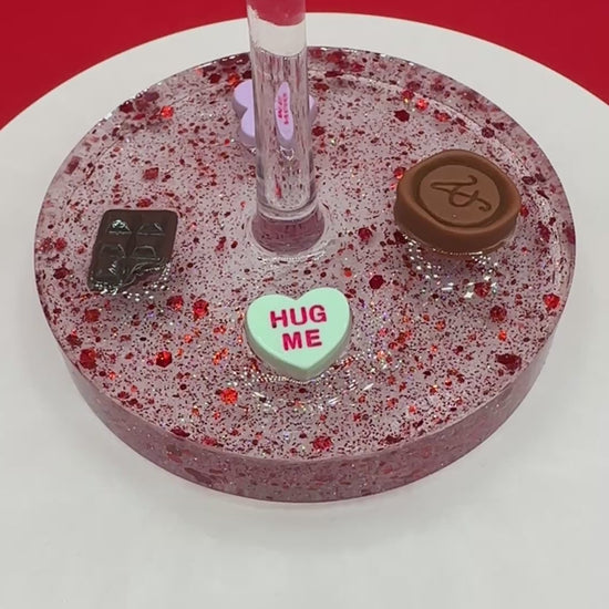 Shatterproof 16 oz acrylic wine glass with Valentine's hearts and chocolates in a red glitter decorative resin base. Hand wash only. This is not dishwasher safe.