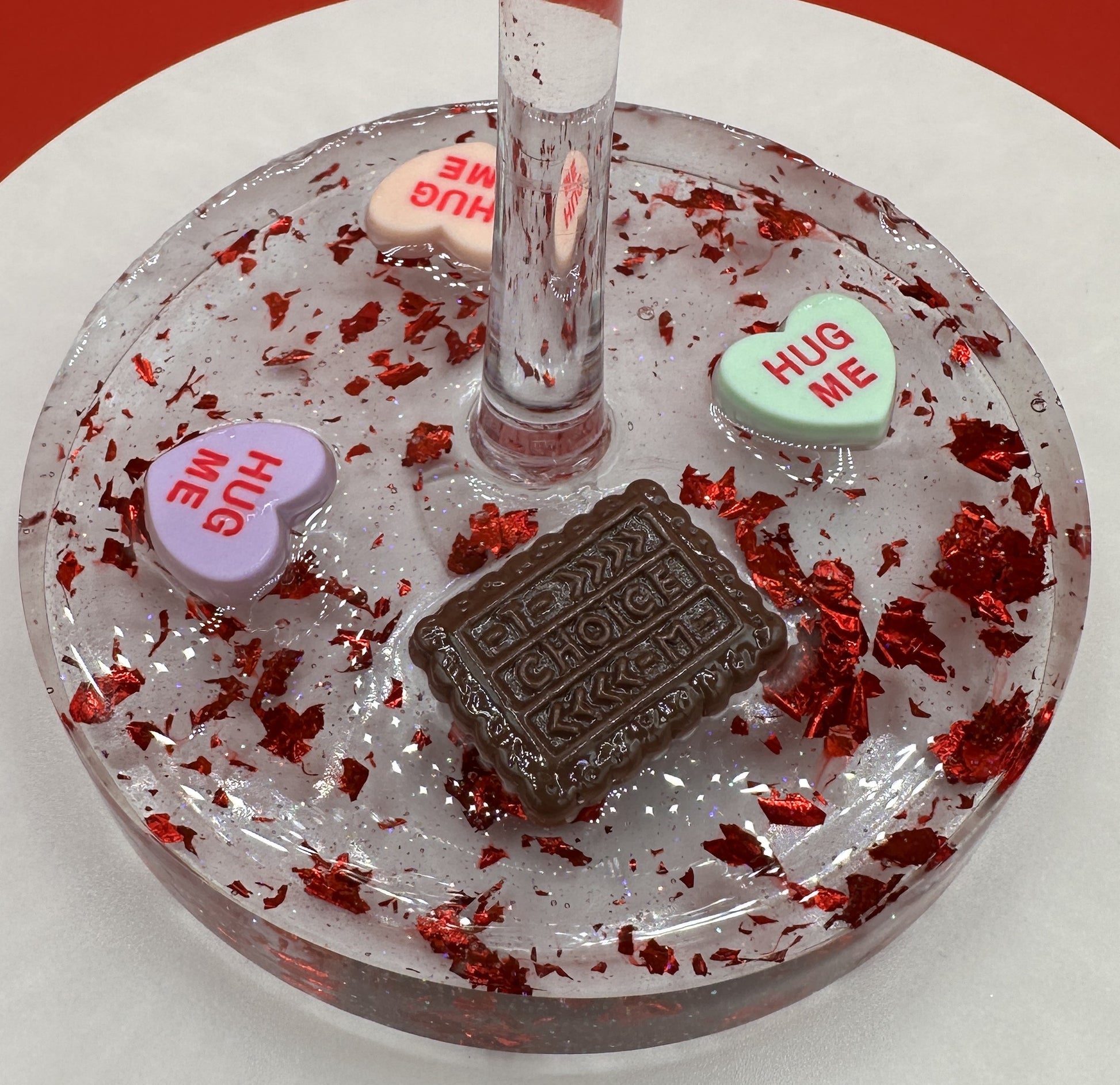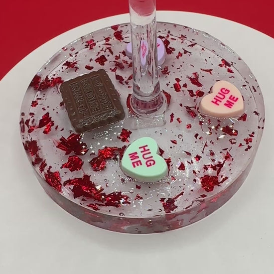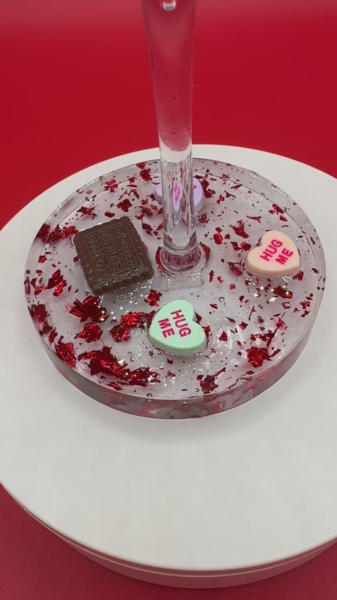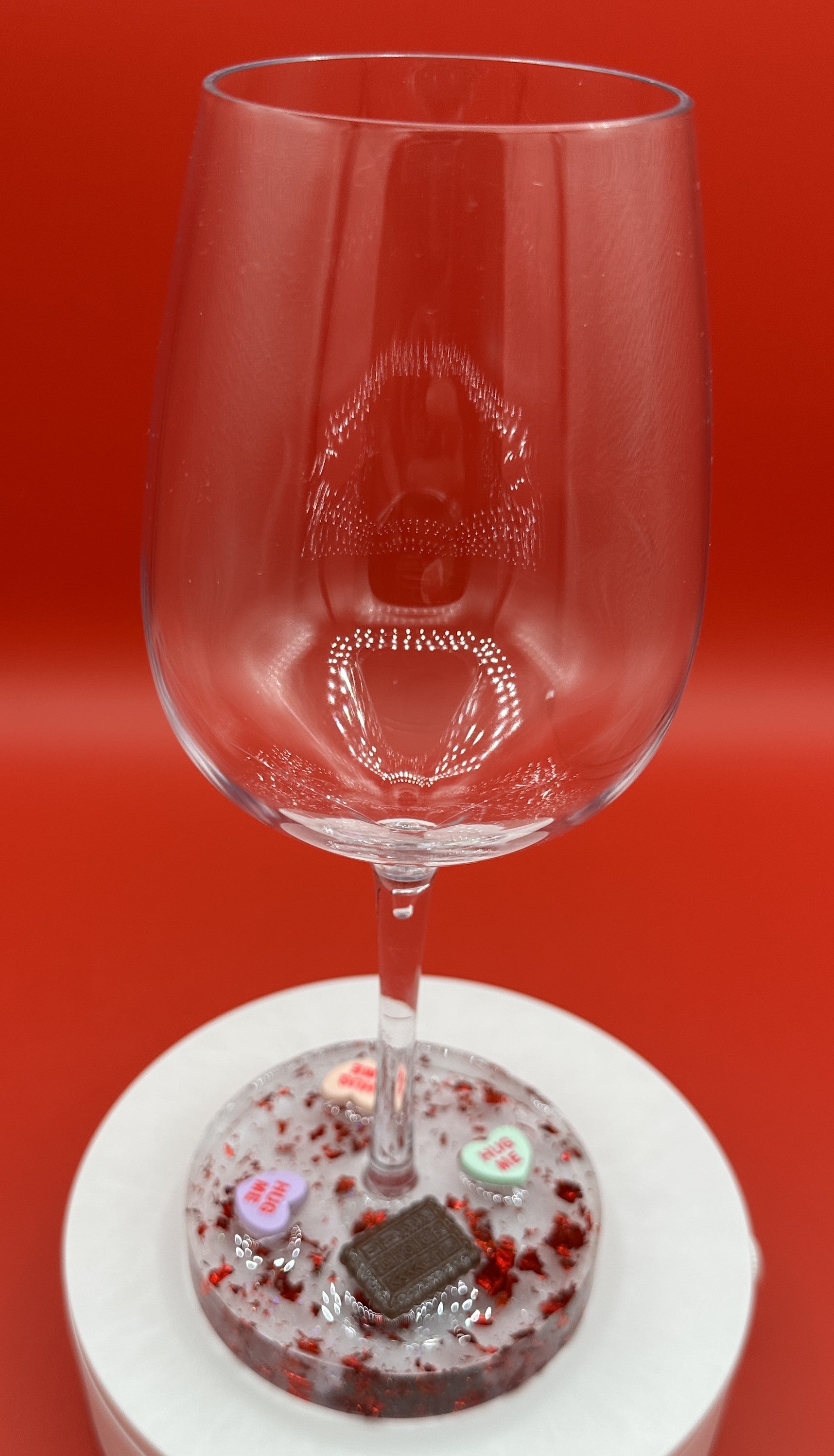 Shatterproof 16 oz acrylic wine glass with Valentine's hearts and chocolates in a red glitter decorative resin base. Hand wash only. This is not dishwasher safe.