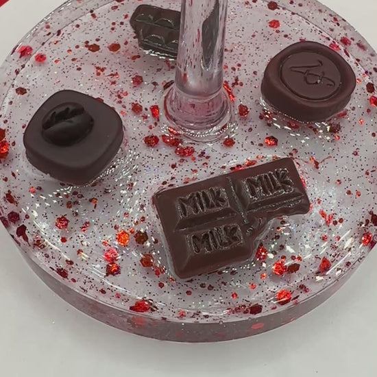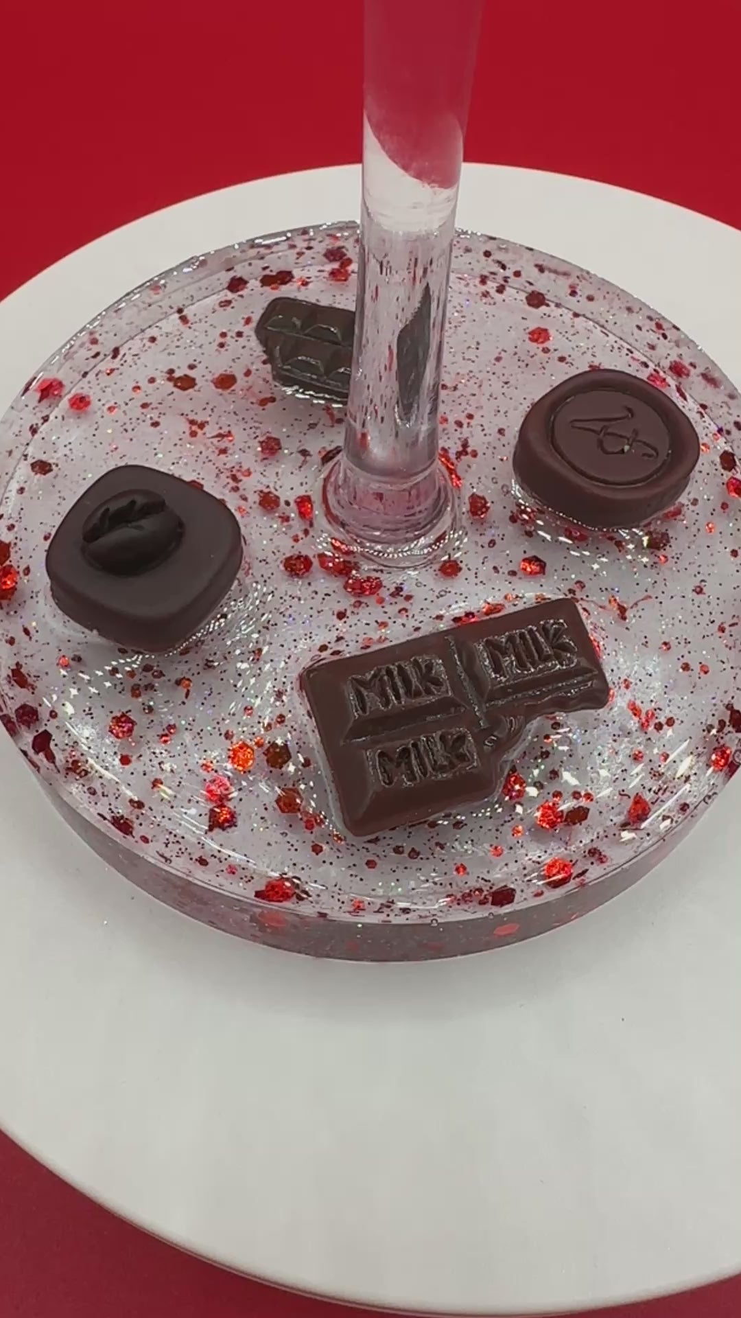 Shatterproof 16 oz acrylic wine glass with Valentine's hearts and chocolates in a red glitter decorative resin base. Hand wash only. This is not dishwasher safe.