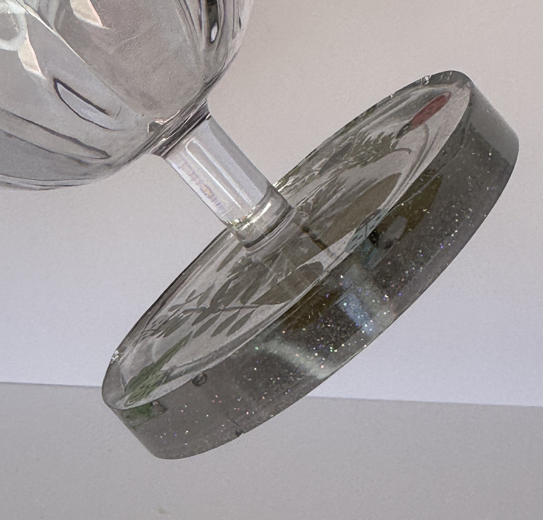 Shatterproof 12 oz clear short stem water goblet, iced tea glass, or wine glass with lady bugs and dried flowers in a decorative resin base. Hand wash only. This is not dishwasher safe.