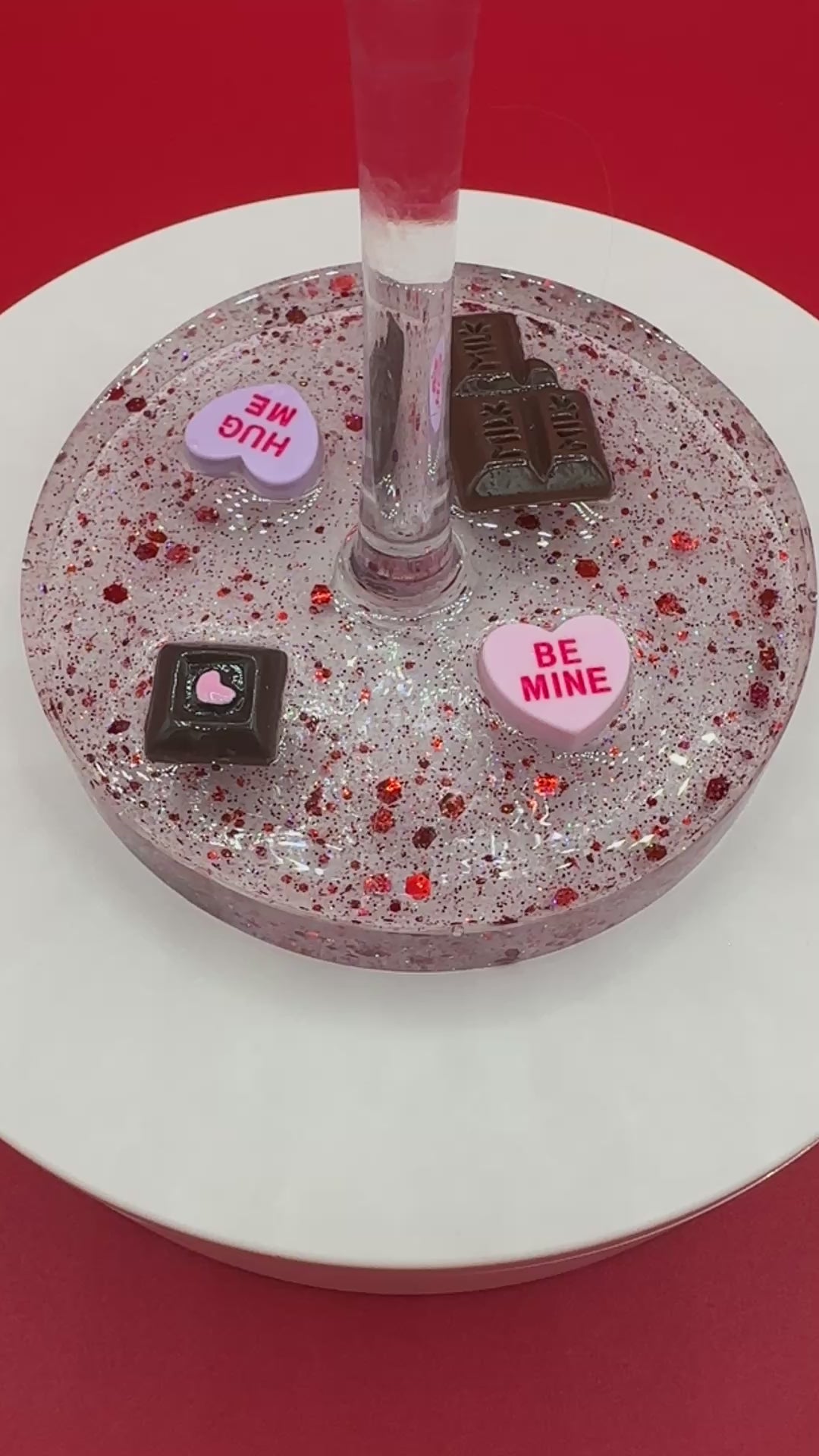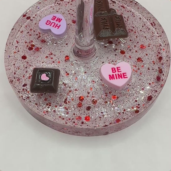 Shatterproof 16 oz acrylic wine glass with Valentine's hearts and chocolates in a red glitter decorative resin base. Hand wash only. This is not dishwasher safe.