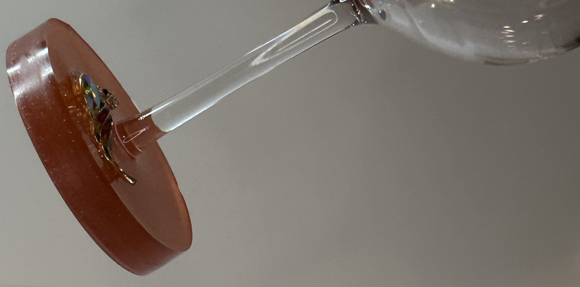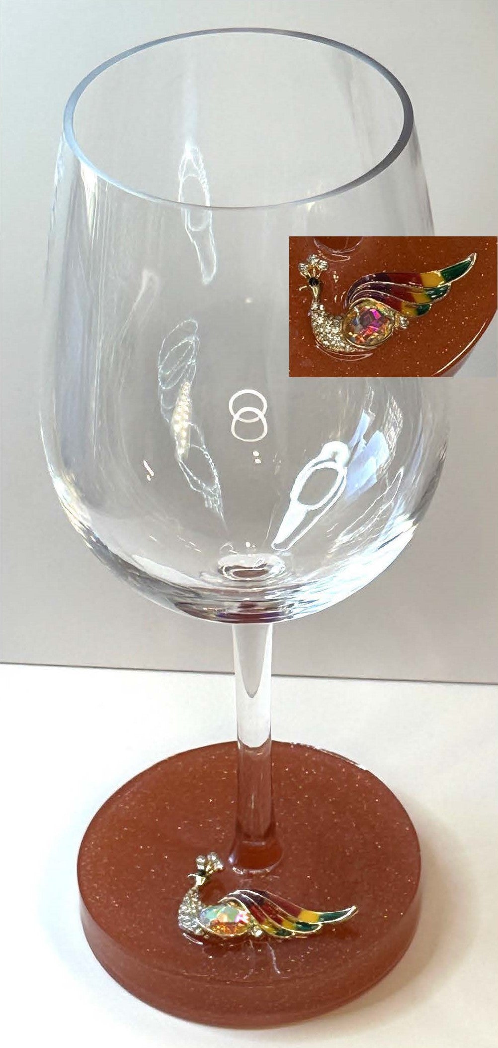 Shatterproof 16 oz acrylic wine glass with a multicolor rhinestone peacock in an apricot color decorative resin base. Hand wash only. This is not dishwasher safe.